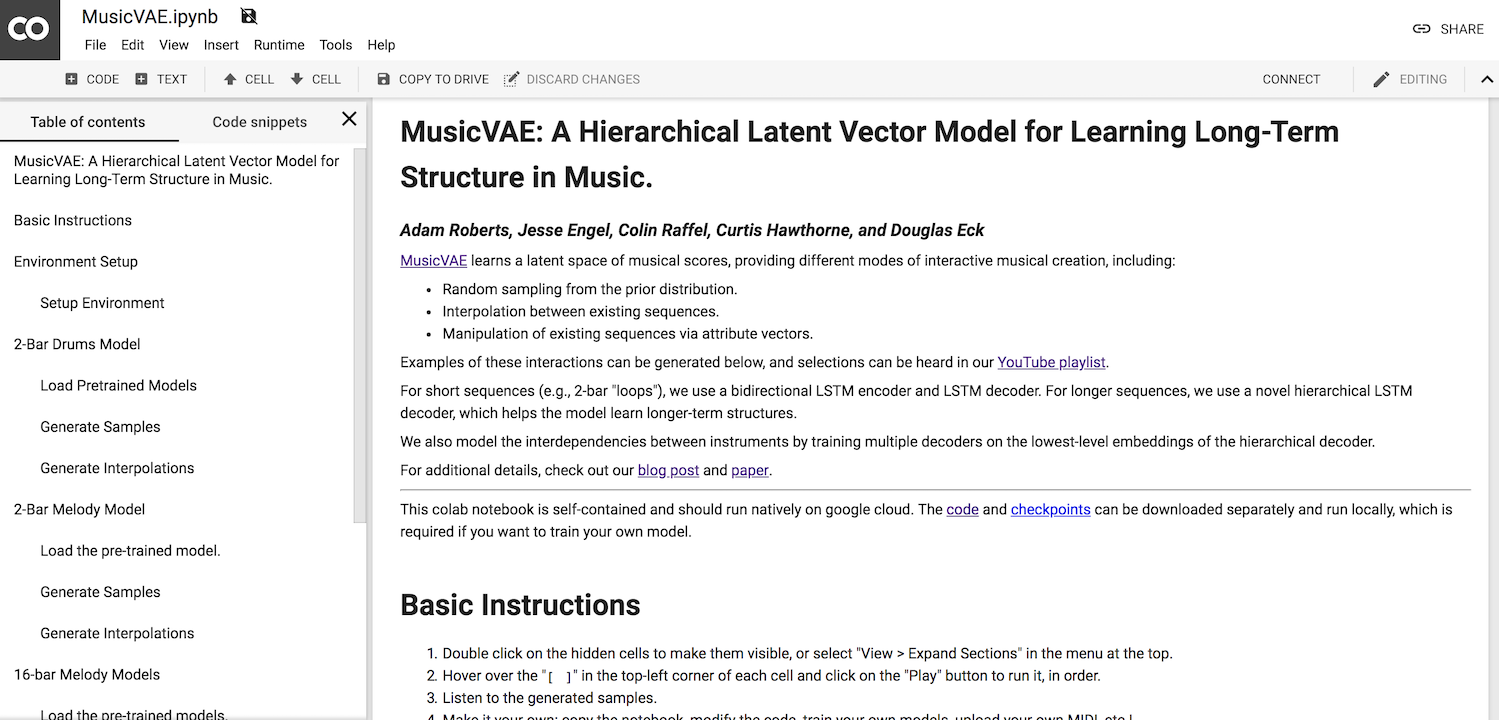 MusicVAE learns a latent space of musical scores. This Colab notebook provides functionality for you to randomly sample from the prior distribution and interpolate between existing sequences for several pre-trained MusicVAE models. You can also compare the results against baseline models described in the MusicVAE paper: A Hierarchical Latent Vector Model for Learning Long-Term Structure in Music.